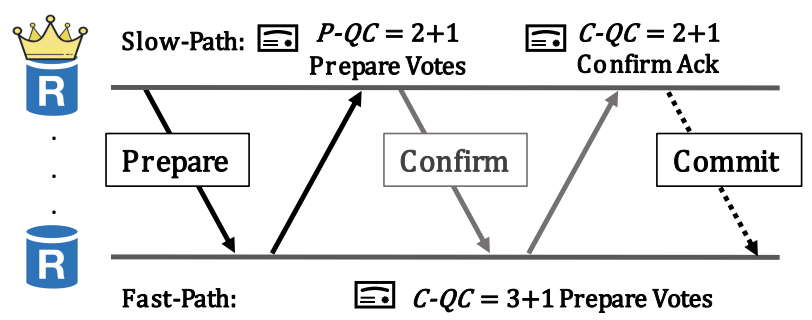 Autobahn's consensus layer follows a classic two-round linear PBFT-style agreement pattern. Instead of proposing blocks, the leader proposes one block with PoA from each lane, forming a lane cut. When a cut is committed, every block in the cut, along with its ancestors up to the previous cut, are committed. The ordering of these blocks are determined locally at each replica through some deterministic algorithm on the set of committed blocks. To achieve seamlessness, the proposed cut includes the PoA for the blocks to convince correct replicas that this cut is safe and they can fetch any missing blocks asynchronously after the blocks are committed. The consensus protocol proceed in (log) slots. For each slot, leader proposes a cut and wait for $2f+1$ votes from replicas indicating they locked in on this proposal (and they will not vote for another proposed cut for this slot) in the prepare phase. It then compose these votes into a quorum certificate (QC), send it to the replicas, and wait for their votes indicating that the decision is durably stored in the confirm phase. Finally, it composes votes from the confirm phase into another QC and send it to replicas for commit before moving to the next slot (5 message delays in total). As an optimization, if the leader receives all $n$ votes during the prepare phase, that means all $2f+1$ correct replicas have locked in for this proposal. When a view-change happens, the new leader will receive this proposal from at least $f+1$ correct replicas. This is sufficient to ensure that the proposed cut is durable and the confirm phase is not needed, enabling a 3-message-delay fast path.