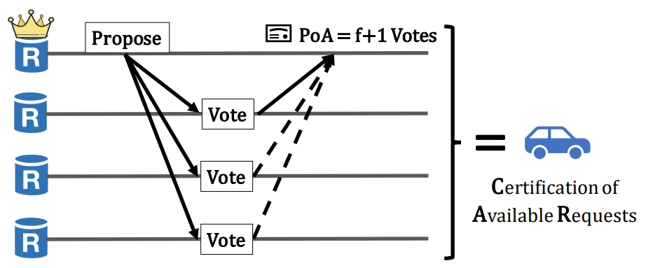 The block dissemination layer ensures that at least one correct replica stores the block so other replicas can always reliably fetch it as needed. In Autobahn, each replica independently batches the requests it receives into blocks and broadcast the block to other replicas in a propose message. Upon receiving a valid propose message from peers, the replica will respond with a vote message. When receiving $f+1$ votes for a proposal, replica can compose these $f+1$ votes into a proof of availability (PoA) indicating that this block is durably stored by at least 1 correct replica and everyone can reliably fetch the block whenever needed. The PoAs are sent to leader and passed to consensus layer. This process of proposing a block and composing the votes into its PoA is called Certification of Available Requests (CAR).