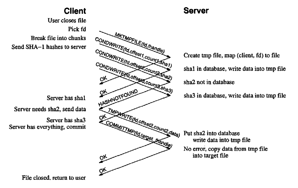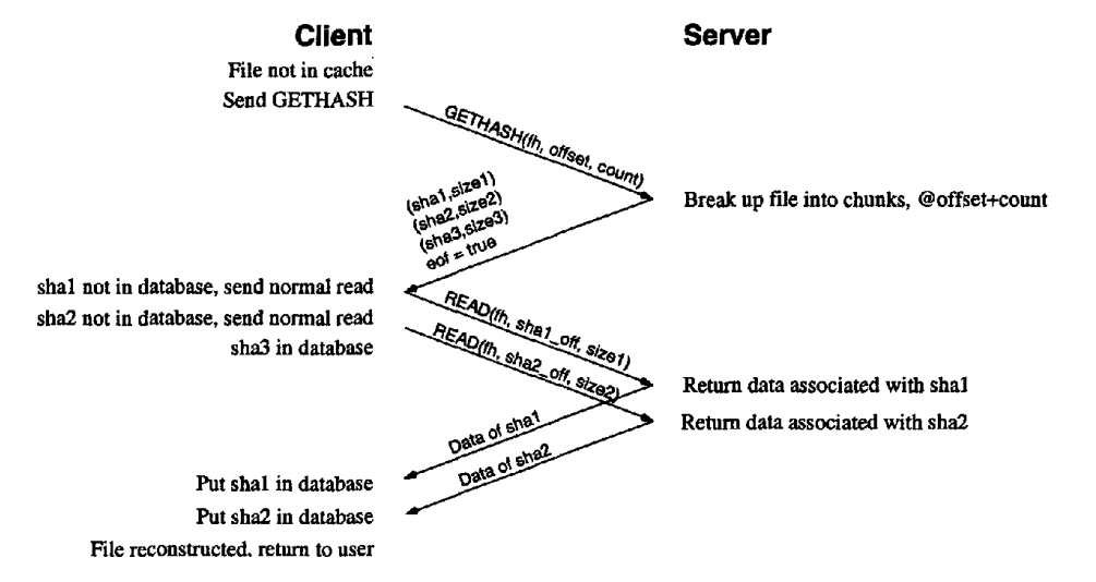 LBFS avoids transmitting data that are already present on the other side. During a read or write, the sender will first break the file into chunks, find the SHA-1 hash of each chunk, and check with the receiver if the same chunks are present on its side. The sender will only send the chunks missing from the receiver side. Below are the routines for reading and writing a file in LBFS. One may notice that during write, the new file is written to a temperate file that will replace the original file atomically when the write completes.